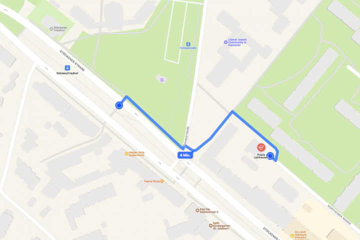 Unsere Praxis befindet sich in Leinhausen und ist über die Bundesstraße B6 sehr gut zu erreichen. Wenn Sie von der B6 kommen, biegen Sie in die Straße "Am Leineufer" ein. Folgen Sie dieser Straße bis zur Einmündung in die Straße "Leinstraße" und biegen Sie rechts ab.